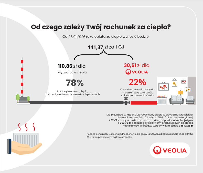 Uprzejmie informujemy, że od 6 stycznia 2026 r. zacznie obowiązywać nowa taryfa za dostawy ciepła Veolii Energii Warszawa. Poniżej przedstawiamy najważniejsze informacje dotyczące wprowadzanych zmian oraz ich wpływu na Państwa rozliczenia.