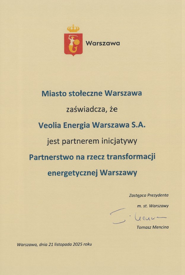 Veolia Energia Warszawa otrzymała również zaproszenie od Wiceprezydenta m.st. Warszawy Tomasza Menciny oraz Zastępcy Dyrektora Biura Infrastruktury Leszka Drogosza do Partnerstwa na rzecz transformacji energetycznej w Warszawie. To inicjatywa, która realnie przyczynia się do zmian w energetyce miejskiej i w której chcemy aktywnie uczestniczyć.